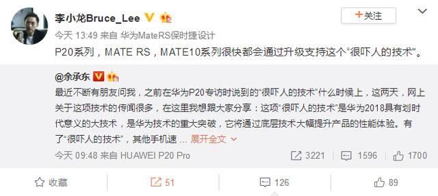 與此同時,讓人欣喜的是"很嚇人的技術(shù)"將會支持現(xiàn)有華為手機產(chǎn)品,同時老機型也有惠及,當(dāng)然旗艦機肯定是優(yōu)先享受這種服務(wù)了。今天下午華為手機產(chǎn)品線副總裁李小龍,在個人微博轉(zhuǎn)發(fā)余承東微博并爆料,華為P20系列,華為Mate RS保時捷設(shè)計,華為Mate10系列等很快都會通過升級支持這個"很嚇人的技術(shù)"。估計其他華為手機機型也很快能用上這項嚇?biāo)廊说募夹g(shù)。