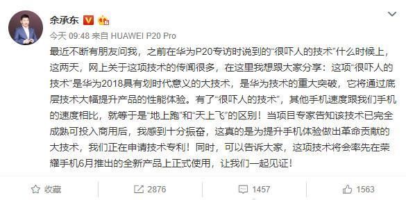 而就在業(yè)內(nèi)人士和網(wǎng)友紛紛猜測的時候,5月23日,余承東在微博上爆料稱,這項"很嚇人的技術(shù)"是華為手機2018具有劃時代意義的大技術(shù),是華為手機技術(shù)的重大突破,它將通過底層技術(shù)大幅提升產(chǎn)品的性能體驗。華為有了"很嚇人的技術(shù)",其他手機速度跟我們手機的速度相比,就等于是"地上跑"和"天上飛"的區(qū)別!